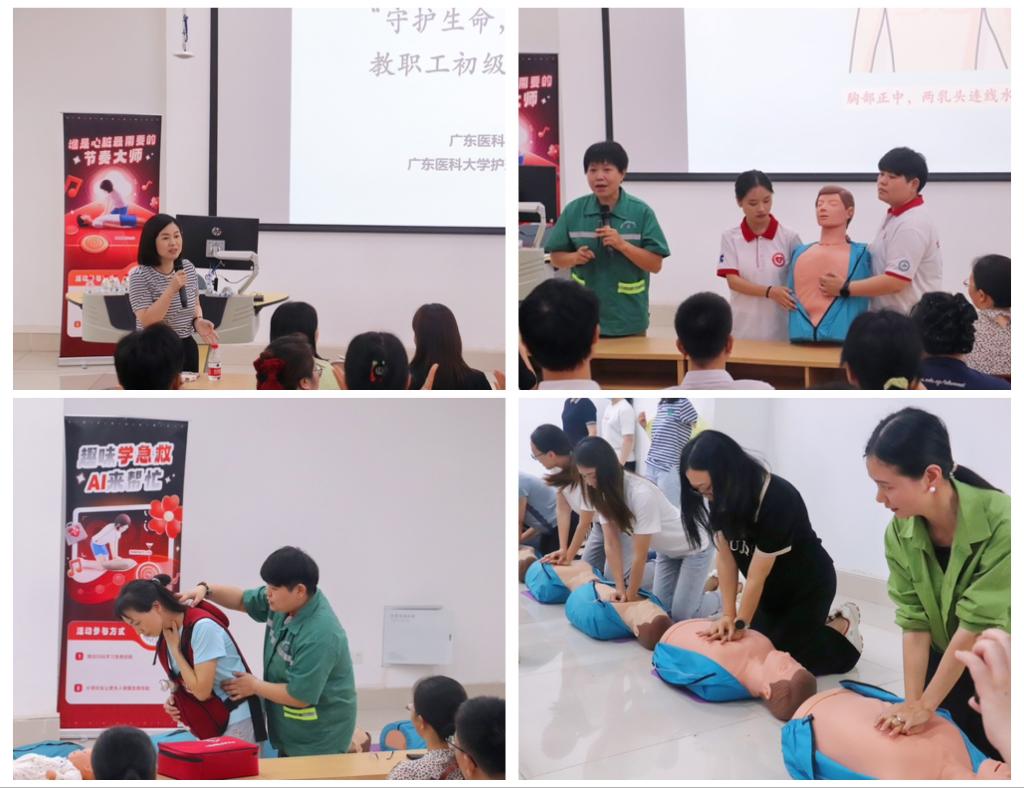 50余名教职工及家属积极报名参加本次培训,本次培训以“线上+线下”相结合的方式进行。所有参训人员须先完成线上课程并通过考试后方可参加线下课程。培训现场,老师详细讲解了心搏骤停识别、心肺复苏、AED(自动体外除颤器)使用及气道异物梗阻救治急救的基本理论和操作要点,实操练习时,老师着重对心肺复苏和海姆立克急救法进行了演示,并认真指导每位学员反复练习。教学实践结束后,所有学员参加了考试并顺利通过考核,获得东莞120院前急救“初级救护员”证书。