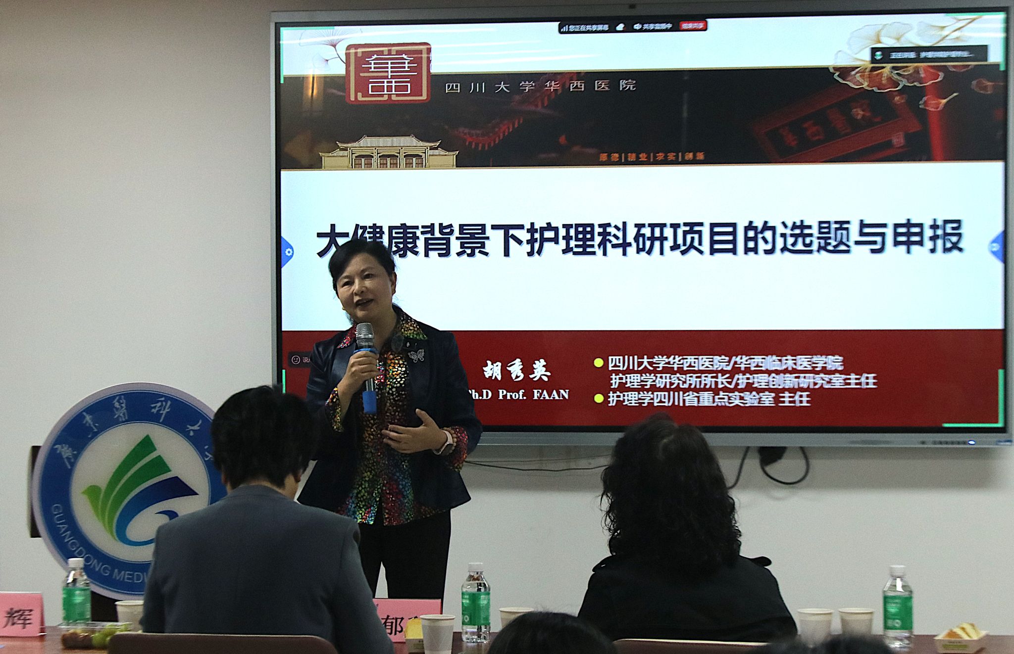 随后,四川大学华西护理创新研究中心主任胡秀英教授以“大健康背景下护理科研项目的选题与申报”为题,深入阐述了在国家大健康战略指引下,护理科研的选题方向与价值内涵,强调了选题的创新性、前沿性及其社会意义,为师生拓宽科研视野提供了战略性指导。
