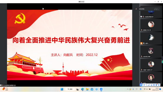 为了深入学习贯彻党的二十大精神,全面学习贯彻习近平总书记关于教育的重要论述,进一步加强我院全体教工和学生党员、入党积极分子的政治理论学习,提高师生的政治理论水平和政治素养,筑牢理想信念根基。12月19号下午,学校党委副书记、纪委书记、广东省监委驻广东医科大学监察专员向献兵通过线上的方式为伟德bv1946官网师生作题为《向着全面推进中华民族伟大复兴奋勇前进》的思政课。思政课由学院党委副书记许崇泰主持,学院全体教职工及学生党员、积极分子代表250余人参加。