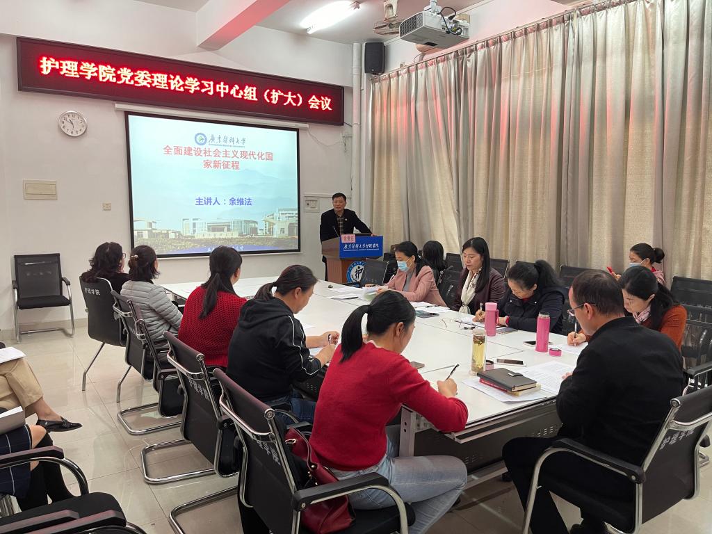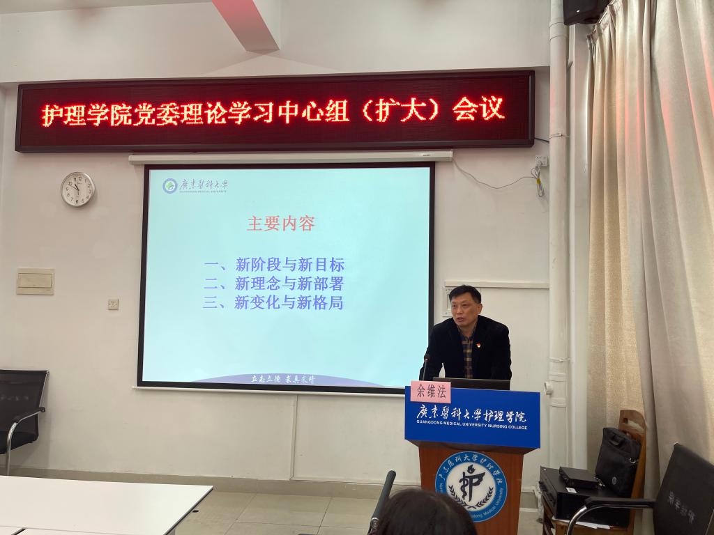 学院党委副书记许崇泰结合学习辅导报告,对学院工作提出三点要求,一要把学习全会精神作为理论武装工作的一项重大任务,结合巩固深化“不忘初心、牢记使命”主题教育成果,制定计划,周密安排,统筹抓好广大党员学习;二要把顶层设计与学院实际有机统一,科学制定学院“十四五”规划,描绘好伟德bv1946官网高质量发展的美好蓝图,把立德树人作为根本任务,全面提高人才培养质量,为社会输送更多更优秀的人才;三要汇聚力量打牢伟德bv1946官网未来的发展根基,学院党委委员和各党支部书记在党建工作、业务工作上要加强调研、认真研究,坚持目标导向、问题导向、结果导向,围绕学院的“十四五”规划,加大人才的引进力度,积极孵化科研团队,对标一流、找准差距,持续深化教育改革深度,融入粤港澳大湾区的发展战略,积极对接全省护理人才的发展需要。