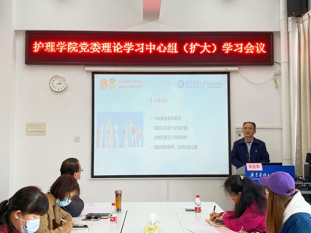 解读结束后,中心组成员李红赞副院长、内外妇儿护理学教研室主任张洪老师、2021级辅导员李瑞琦老师等三位老师分别从“五个必由之路”重要论断内涵学习;护理、养老等领域的两会议案及现实情况;高等院校教师政治素养等三个方面分享了学习心得,他们纷纷表示,要进一步深入学习宣传贯彻两会精神,增强政治自觉、坚定历史自信,不断提高自身的理论水平,并运用到实际工作中,提升工作效率和质量。